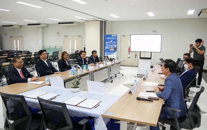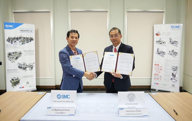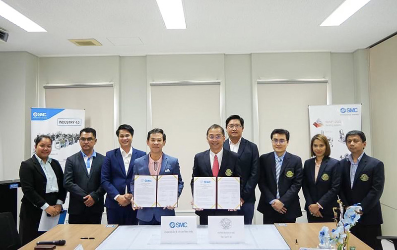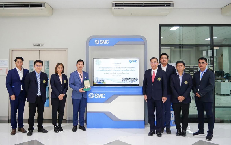 บริษัท เอส.เอ็ม.ซี (ประเทศไทย) จำกัด ลงนามความร่วมมือทางวิชาการ (MOU) ร่วมกับ รศ.ดร.สถาพร เชื้อเพ็ง คณบดี คณะวิศวกรรมศาสตร์ มหาวิทยาลัยเกษตรศาสตร์ วิทยาเขตศรีราชา มีวัตถุประสงค์ร่วมกันในการสนับสนุนอุปกรณ์นิวเมติกส์ (Good Donation) เพื่อใช้ประโยชน์ด้านการเรียนการสอน งานวิจัยและพัฒนาการจัดถ่ายทอดเทคโนโลยีนิวเมติกส์ให้กับบุคลากรและนิสิต (Train The Trainer) รวมถึงการรับนิสิตเขาฝึกงาน สหกิจศึกษา (Student Internship)